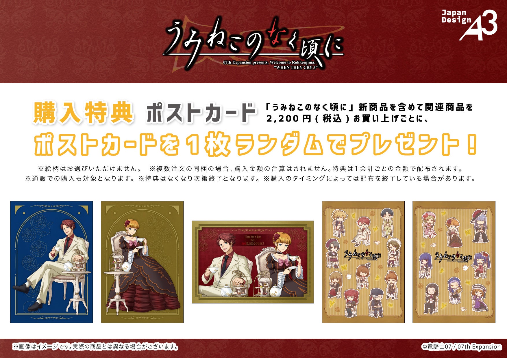 『うみねこのなく頃に』新商品を含めて関連商品を1会計2,200円(税込)お買い上げごとに、購入特典としてポストカード(全5種)をランダムで1枚プレゼント。特典はなくなり次第配布終了となるので、新作グッズとあわせて早めにゲットしてください!