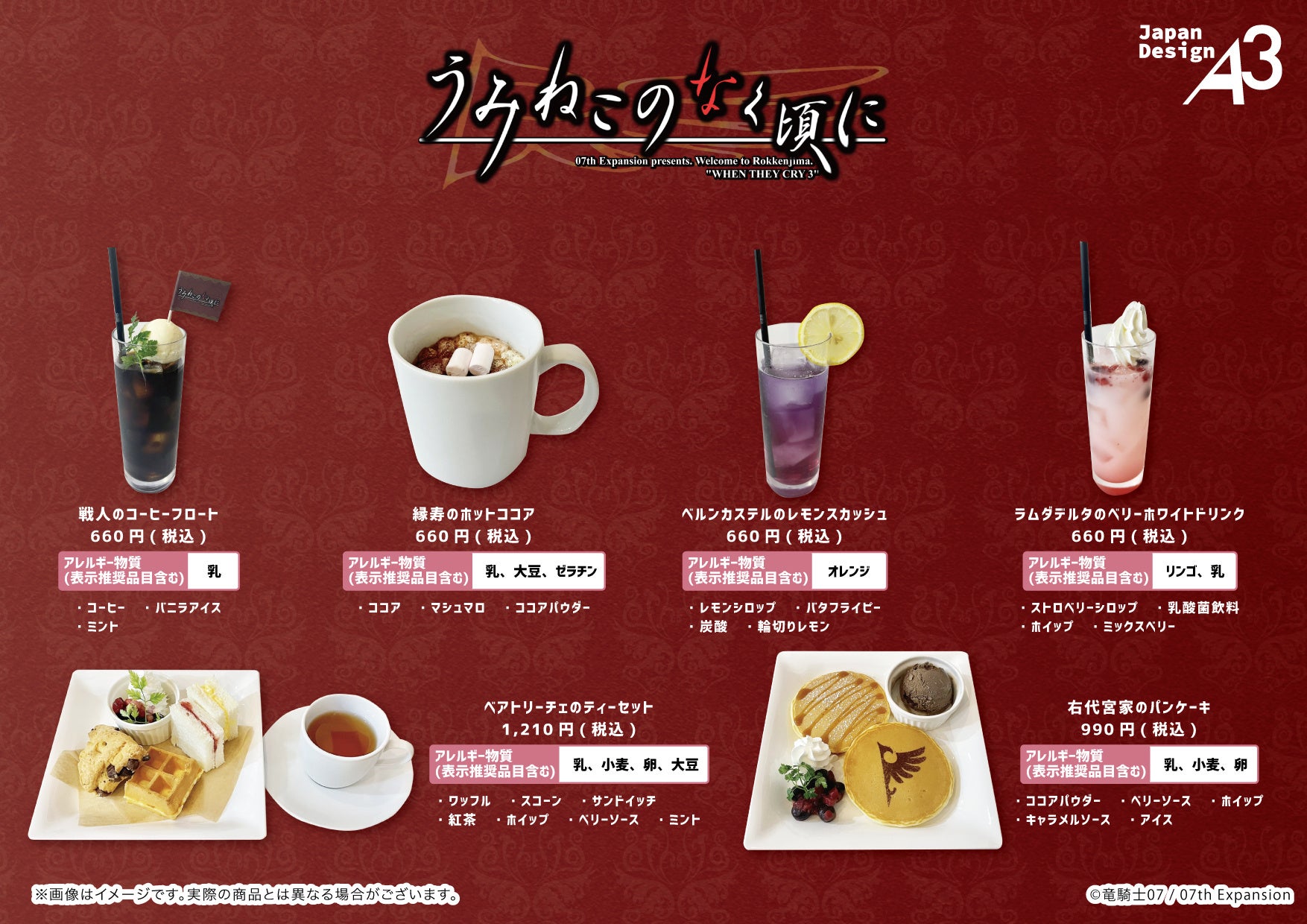 コラボメニューでは、「右代宮家のパンケーキ」や戦人などの登場キャラクター達をイメージしたドリンクが販売されます。大好きな作品に囲まれながら素敵な時間を思う存分お過ごしください♪