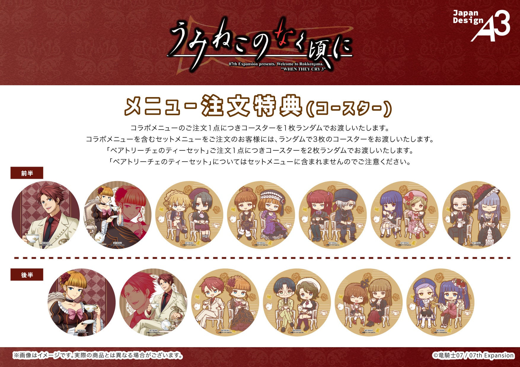 コラボメニューをご注文いただいた方には1枚、コラボメニューを含むセットメニューをご注文いただいた方には3枚、「ベアトリーチェのティーセット」をご注文いただいた方には2枚を、それぞれランダムでプレゼント。