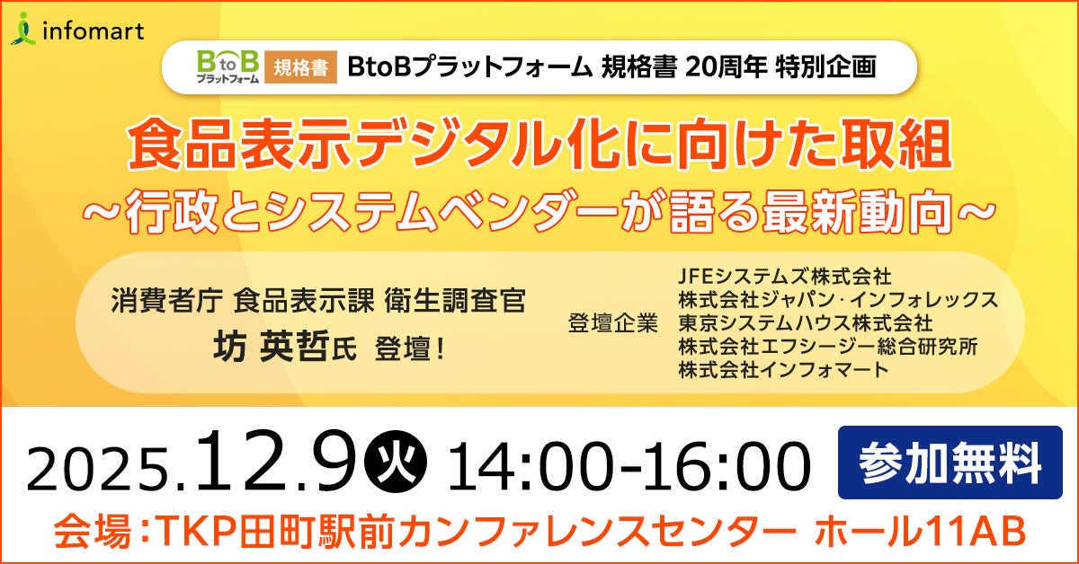 デジタルの力であらゆる業務を効率化する株式会社インフォマート(本社:東京都港区 代表取締役社長:中島 健、以下「当社」)は、「BtoBプラットフォーム 規格書」の20周年を記念した特別セミナー「食品表示デジタル化に向けた取組 ~行政とシステムベンダーが語る最新動向~」(以下、本セミナー)を、2025年12月9日(火)にTKP田町駅前カンファレンスセンターにて開催します。