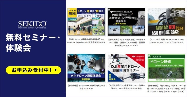 セキドでは、より多くの事業者の方にドローンを使った業務効率の改善を実現していただくため、業務用ドローンや関連ソリューションをご紹介する無料セミナーやイベントを定期的に開催しております。今後もオンラインや全国各地での開催を予定しておりますので、ご興味をお持ちのイベントにはぜひお気軽にご参加ください。