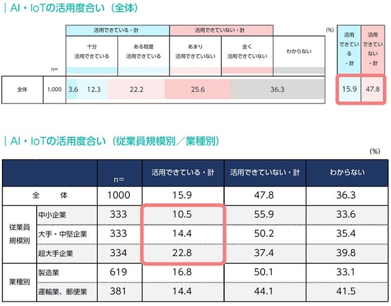 製造または物流の現場でAI・IoTを活用している度合いについて、「あまり活用できていない」「全く活用できていない」の合計が47.8%で、「十分活用できている」「ある程度活用できている」の合計15.9%を大幅に上回った。従業員規模別には、規模が大きいほど「活用できている」ポイントが上がり、業種別には大きな差はなかった。