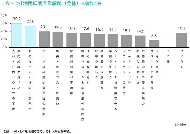 AI・IoTを活用できている企業に対して、活用に関する課題を尋ねたところ、「専門人材を持った人材・社内ノウハウの不足」「対応できる人材の工数不足」が上位回答となった。