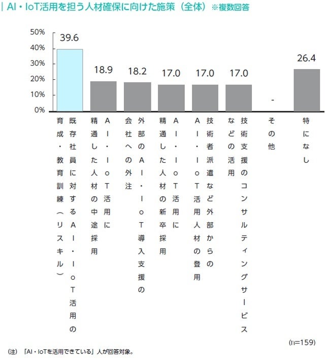 AI・IoTを活用できている企業において、AI・IoT活用を担う人材確保のために行っている施策について聞いたところ、「既存社員に対するAI・IoT活用の育成・教育訓練(リスキル)」を行っている割合は39.6%にのぼった。