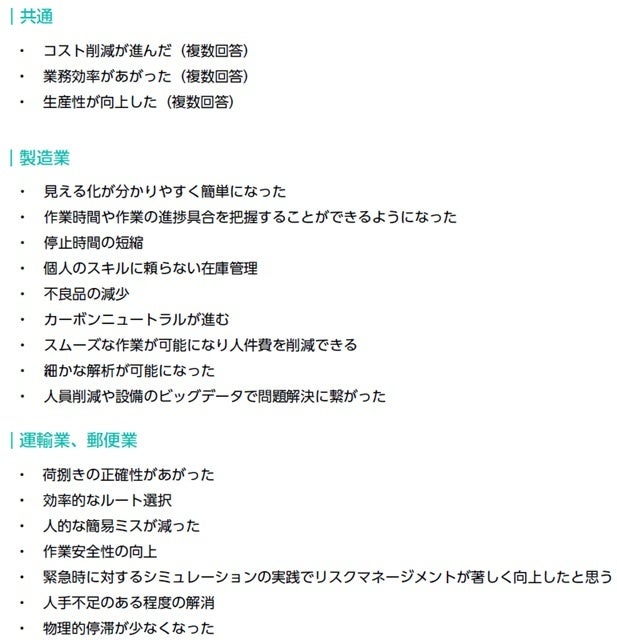 「AI・IoTを活用できている」と回答した人を対象に、得られた成果についてフリーコメントで尋ねた。抜粋したものを以下に紹介する。