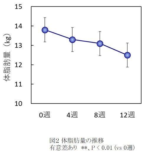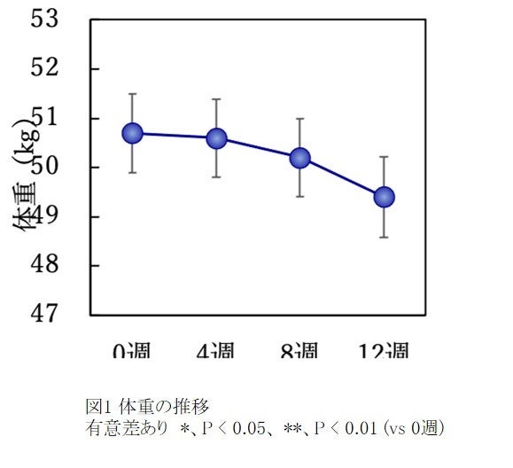 体重、体組成 :体重、体脂肪量が有意に減少。筋肉量は維持