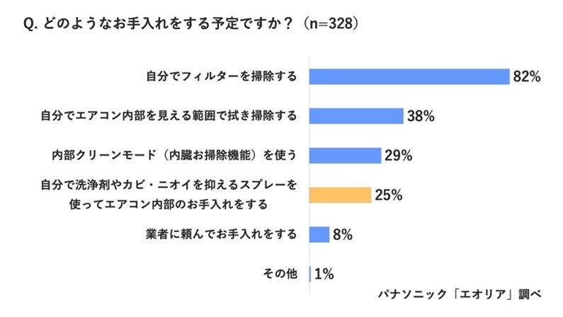 夏じまいの方法としては、「自分でフィルターを掃除する」が82%と最多に。一方、「自分で洗浄剤やカビ・ニオイを抑えるスプレーを使ってエアコン内部のお手入れをする」が25%となりましたが、これは実は間違ったお手入れ方法です。内部に残った洗浄剤で故障の原因につながる恐れがあります。