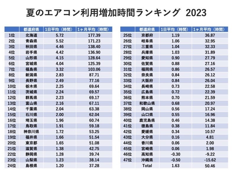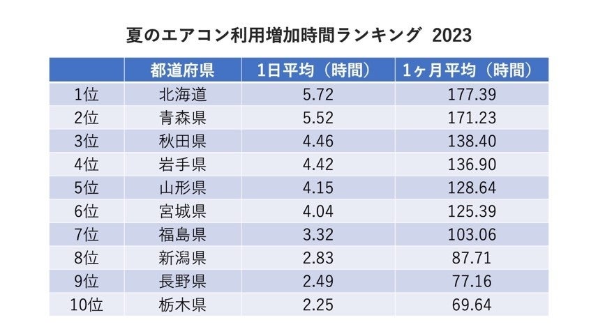 気象庁によれば、8月の気温平年差は北海道で+3.7℃、東北で+4.2℃となりました。エアコン利用増加時間ランキングにおいても、北海道・東北地方の全7道県が上位7位を席巻することとなり、その全てで1ヶ月平均で100時間以上昨年からエアコンの利用時間が増加しています。