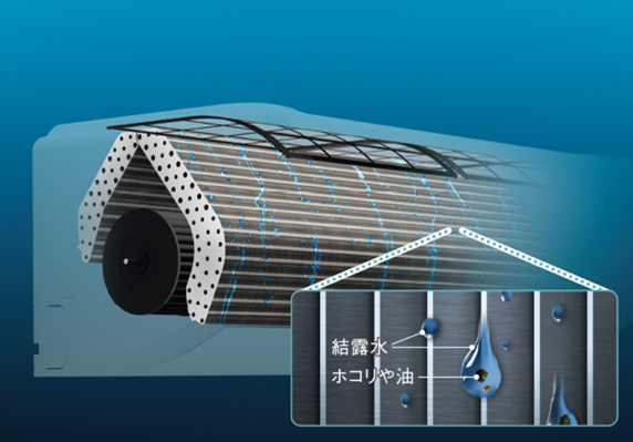熱交換器の表面(切断面)まで独自技術でコーティング。 カビの栄養源となるホコリや油分の付着を防ぎ、付着してもつるっと洗浄(冷房・除湿運転時)