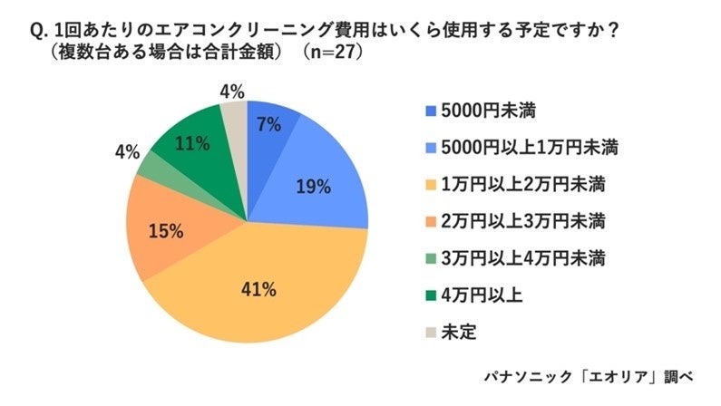 「業者に頼んでお手入れをする」と回答した方に1回あたりのエアコンクリーニング費用を聞いたところ、「1万円以上2万円未満」が41%と最多となる一方、中には「4万円以上」と回答した方も11%にのぼりました。