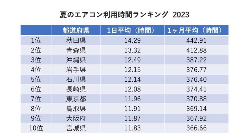 今年8月、全国で最もエアコン冷房利用時間が多かったのは秋田県で、1日平均14.29時間、1ヶ月平均442.91時間という結果になりました。