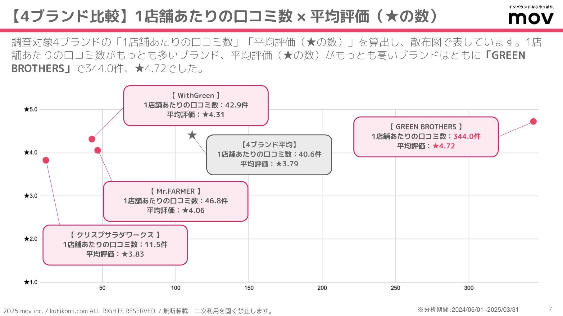 ■ 1店舗あたりの口コミ数・平均評価がもっとも多い(高い)ブランドは「GREEN BROTHERS」