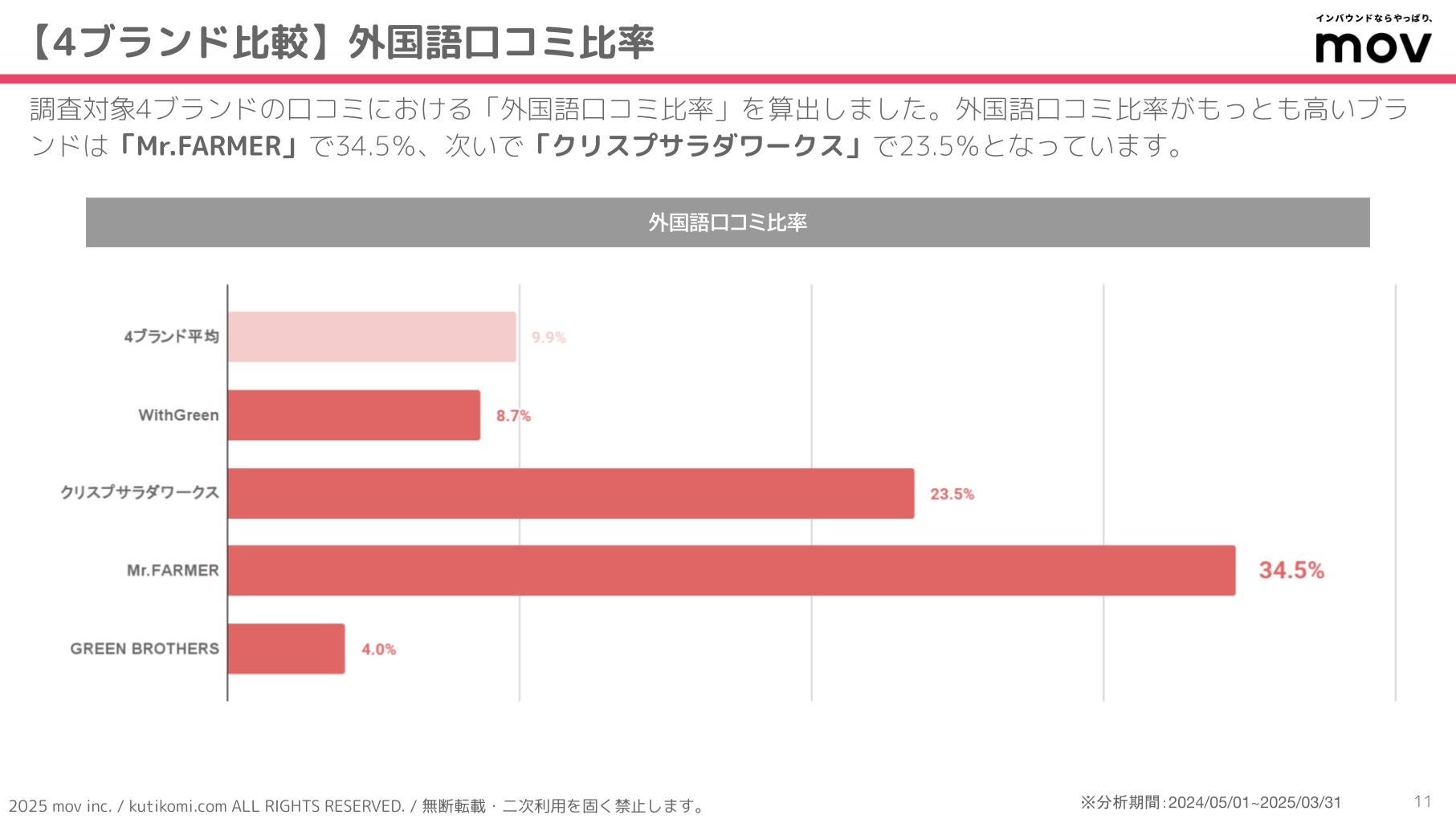 こちらのグラフでは、調査対象4ブランドの口コミにおける「外国語口コミ比率」を算出しています。外国語口コミ比率がもっとも高いブランドは「Mr.FARMER」で34.5%、次いで「クリスプサラダワークス」で23.5%となっています。