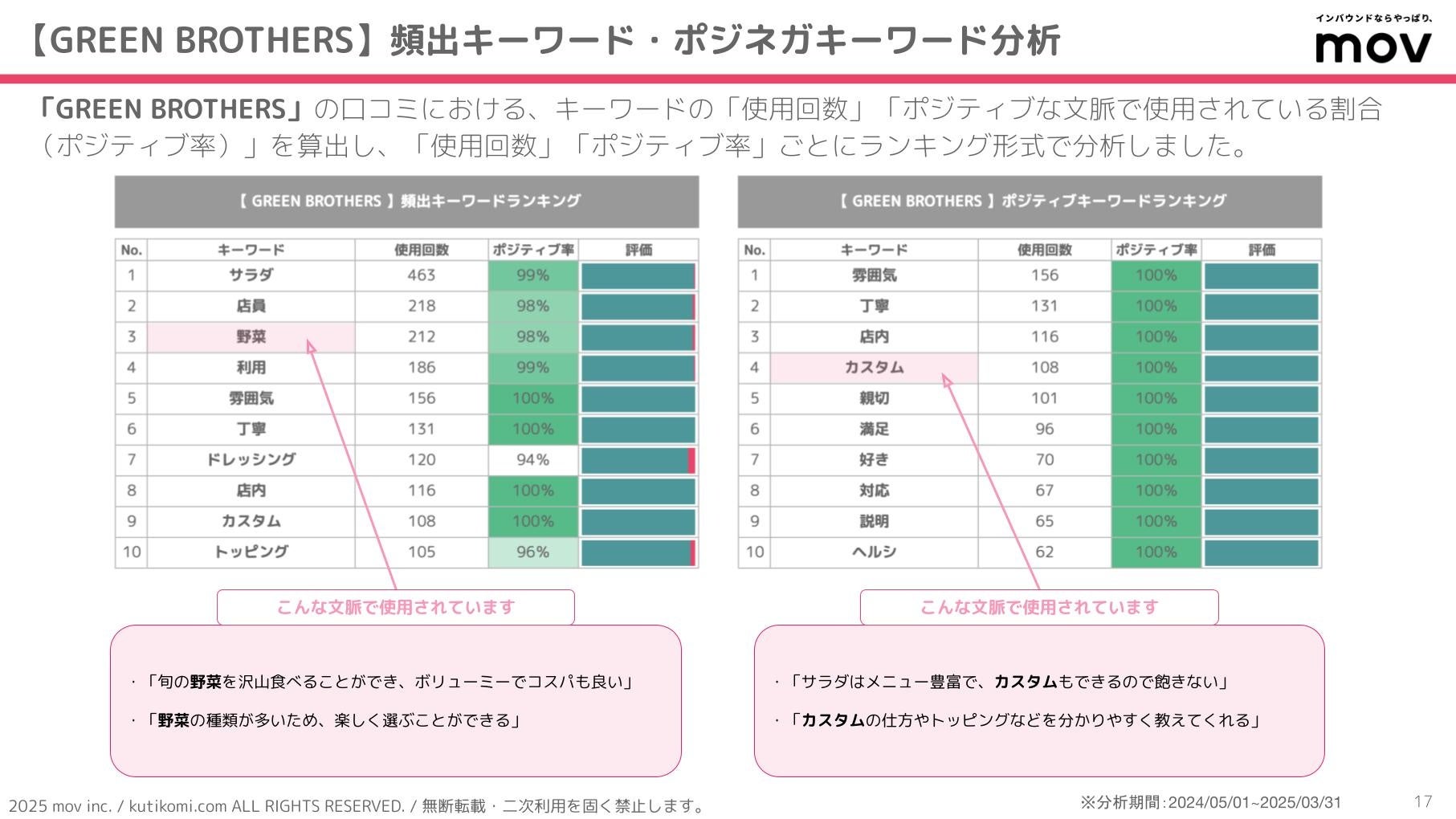 こちらの表では、「GREEN BROTHERS」の口コミにおける、キーワードの「使用回数」「ポジティブな文脈で使用されている割合(ポジティブ率)」を算出し、「使用回数」「ポジティブ率」ごとにランキング形式で分析しています。