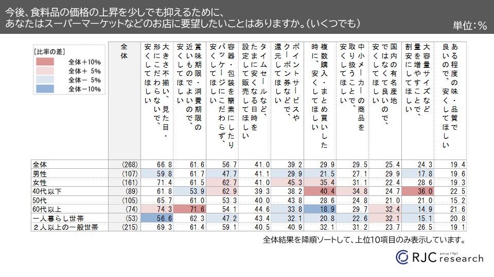 ● 食料品の価格上昇を抑えるためにスーパーなどのお店に要望したいことは、 「大きさ不揃い、見た目・形にこだわらないで、安くしてほしい」 「賞味期限・消費期限の近いもので良いので、安くしてほしい」 「容器・包装を簡素にして、パッケージにこだわらず、安くしてほしい」 など。