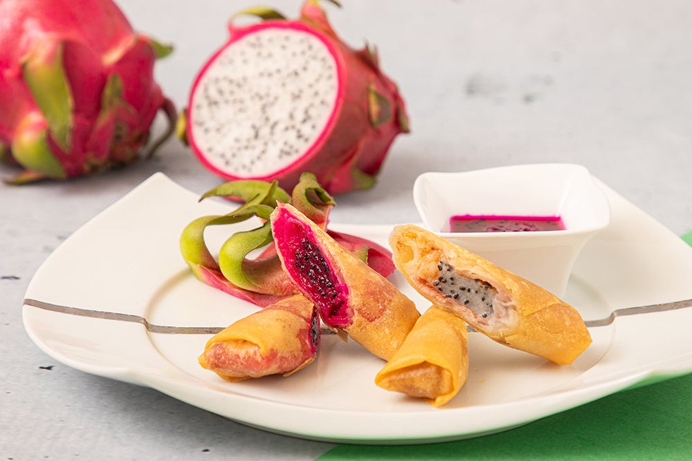 赤と白の2種類のドラゴンフルーツを春巻きの皮でサクッと揚げた一品。シナモンの香りと生ハムの塩味が特徴です。赤いドラゴンフルーツと甘辛いチリソースを合わせたソースでお召し上がりください。