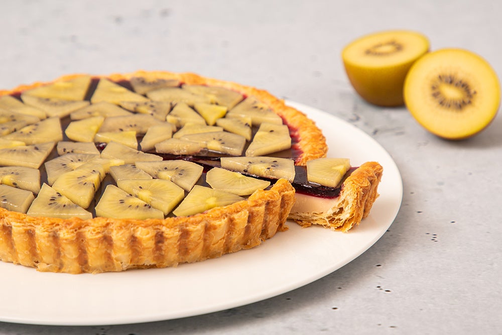 日本人向けに開発されたゴールデンキウイは、甘みが強く、程よい酸味がフォアグラと良く合います。フォアグラのムースとポルト酒のジュレとともにタルトに仕上げました。