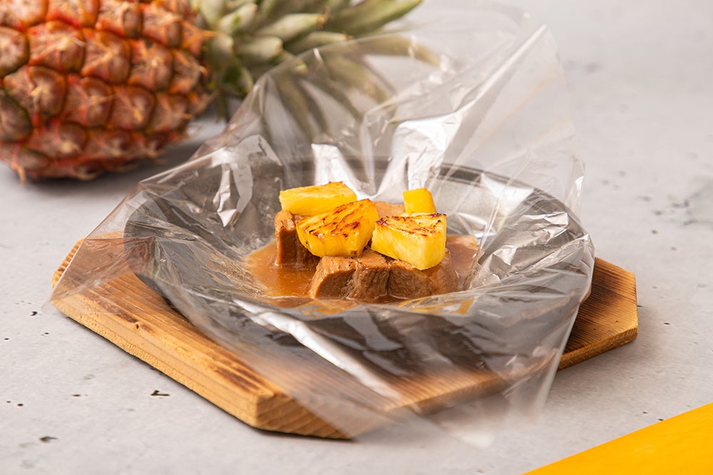 包みを開けるとピーチパインの桃のような香りが立ち上がります。じっくりと焼き上げた島豚をパインの香りと甘みとともにお召し上がりいただけます。