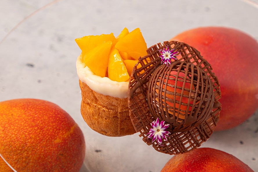 麦わら帽子をイメージしたチョコレートの下はシュークリーム。中にはマンゴーがたっぷり詰まっています。