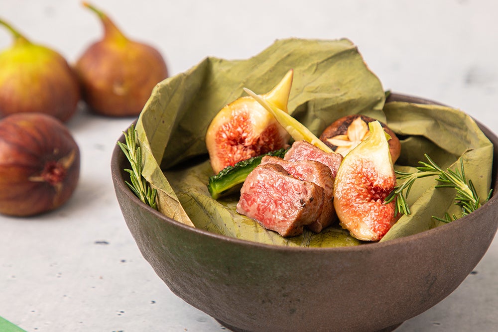 無花果の発酵出汁に漬け込んだおきなわ和牛と島野菜を葉で包んで焼き上げた一皿。器に被せた和紙を燃やし、無花果ソースとともにどうぞ。