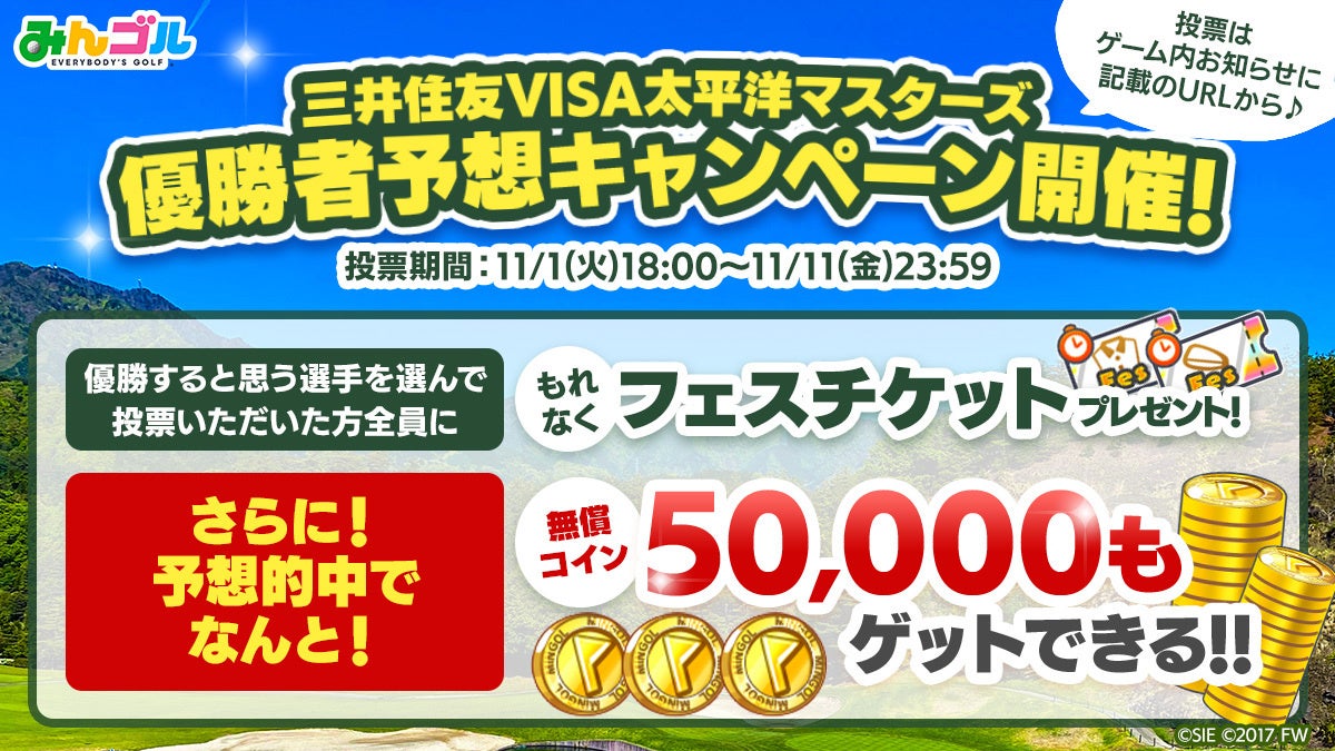 さらに『みんゴル』では、「三井住友VISA太平洋マスターズ」の優勝者の予想・投票するだけで『みんゴル』のアイテムをプレゼントし、さらに予想が当たった方にはもれなく、50,000コイン※1をプレゼントするキャンペーンを開催いたします。