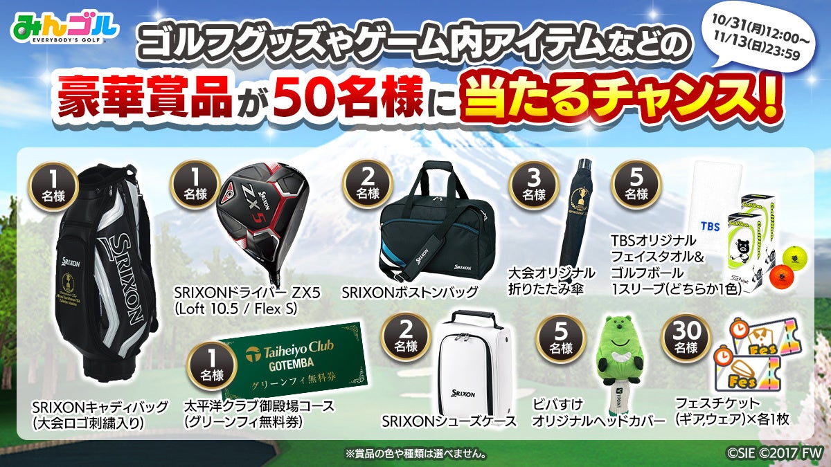 「三井住友VISA太平洋マスターズ」とのコラボイベントの開催を記念して、『みんゴル』公式Twitterにて、抽選で50名様に豪華賞品が当たるプレゼントキャンペーンを開催いたします。