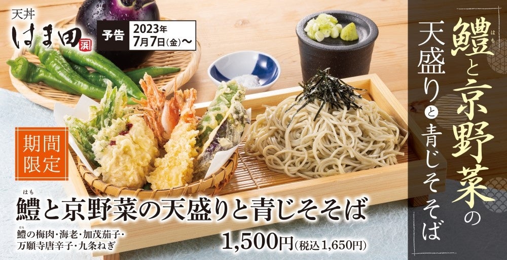 わざわざ電車に乗らなくていい、有名な老舗までいかなくてもいい。 一緒に遠出できなかった家族や友人と一緒に、自分へのご褒美や大切な人との記念日に、自宅の近隣でゆったりと食事ができる「天丼はま田」にて夏の新作「鱧と京野菜の天盛りと青じそそば」を2023年7月7日(金)より販売開始いたします。