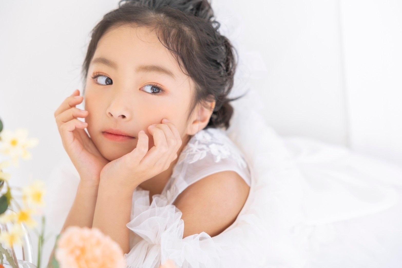 メイクは子どもらしい透明感を残したまま、目元やチーク、リップで印象的に。