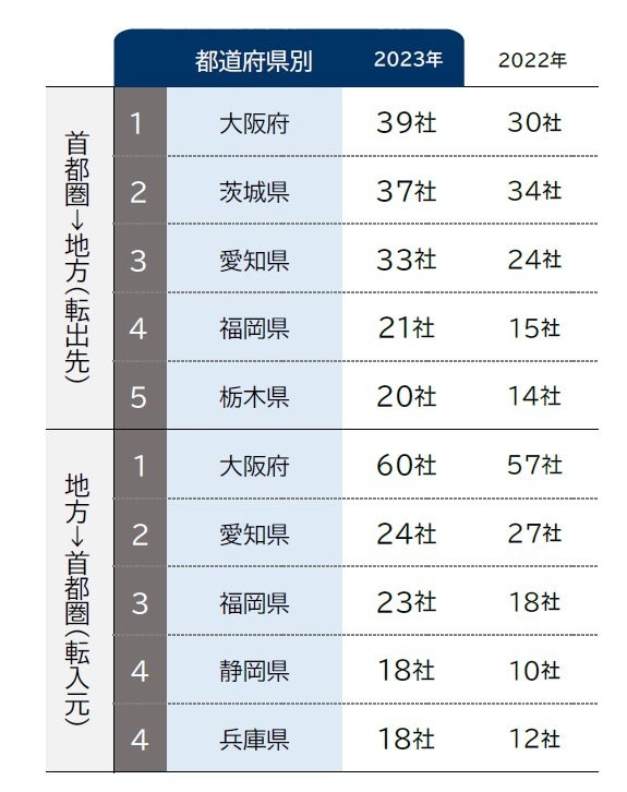 地方から首都圏へ移転した転入元では、「大阪府」(60社)が最も多かった。次いで「愛知県」(24社)、「福岡県」(23社)、「静岡県」(18社)などが続いた。