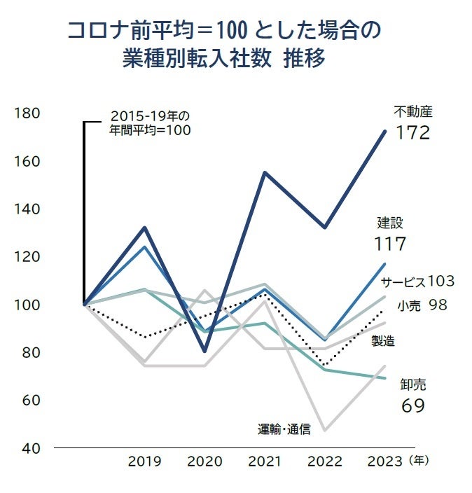 首都圏へ転入した業種を、コロナ前平均(2015-19年の年間平均=100)と比較すると、2023年は「不動産業」が172と、前年から40ポイント高い水準で推移した。「建設業」も117と高く、「サービス業」(103)などに比べても突出した高さだった。東京都心を中心とした再開発事業や、オフィスビルの仲介需要などが旺盛なことも、地方から首都圏へ建設関連産業が大幅に流入した要因とみられる。他方、「卸売業」や「運輸・通信業」など流通産業の転入は、コロナ前に比べて大幅に少ない水準で推移した。