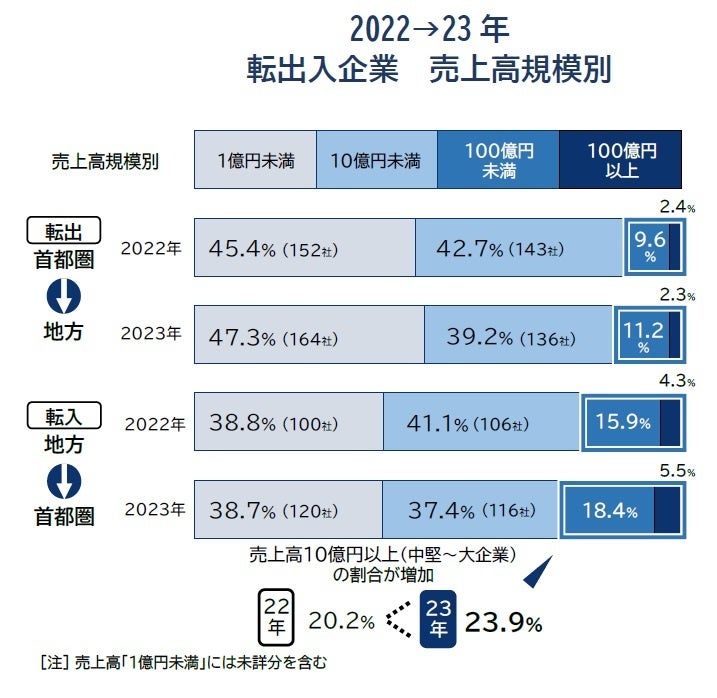 帝国データバンクは、2023年に首都圏(東京・神奈川・千葉・埼玉:1都3県)⇔地方間をまたいだ「本社所在地の移転」が判明した企業(個人事業主、非営利法人等含む)について、保有する企業概要データベースのうち業種や規模が判明している企業を対象に分析を行った。