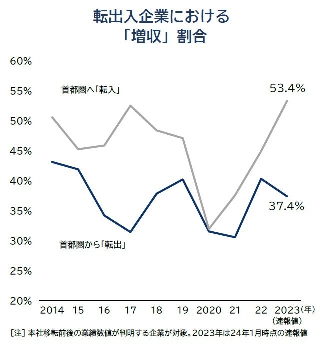コロナ禍当初は、急激な環境変化を理由に業績が急変し、オフィス賃料などランニングコストの高い首都圏から地方へと移転する動きが急増した。首都圏外へ移転した転出企業のうち、移転年の売上高が前年から増加(「増収」)した割合は2021年で30.6%と低水準で推移した。23年の転出企業では、「増収」の割合が37.4%まで回復したものの、依然として業績の悪化といった背景を抱えた企業が多かった。