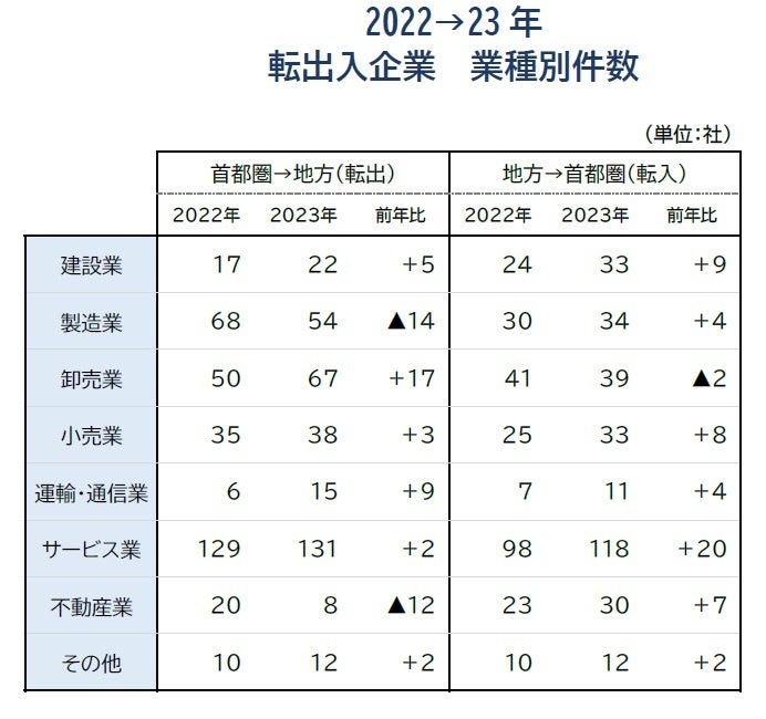 首都圏への転入「サービス業」が最多 「不動産業」は過去最多の30社が転入、コロナ前平均の1.7倍