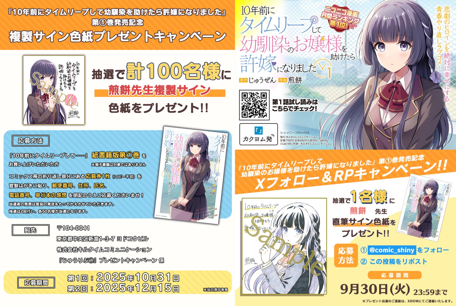 キルタイムコミュニケーション(東京都中央区)は、シャイニーコミックス『10年前にタイムリープして幼馴染のお嬢様を助けたら許嫁になりました1』の発売記念プレゼントキャンペーンを開催いたします。