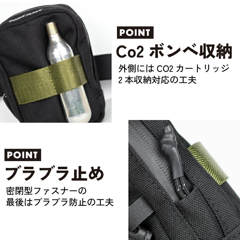 内部にはメッシュポケット2つ、外側にはCO2カートリッジ収納対応の工夫もあり、