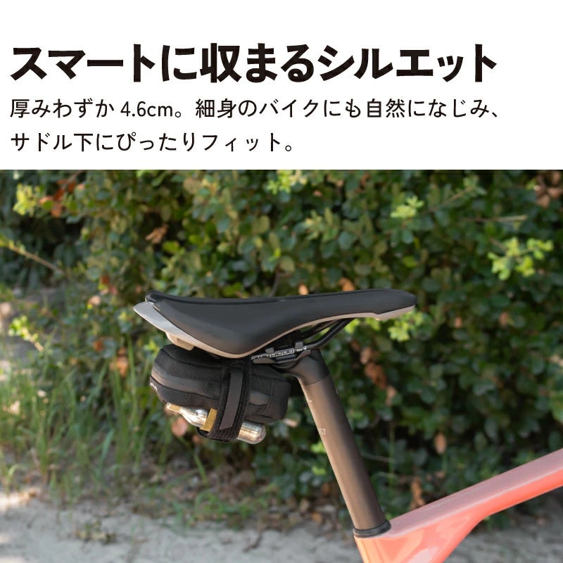 厚みわずか4.6cm。細身のバイクにも自然になじみ、サドル下にぴったりフィットします。