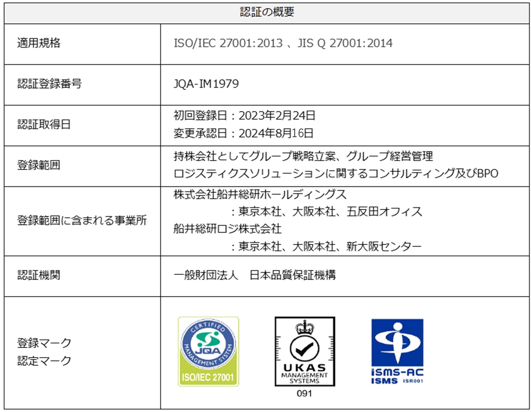 日本最大級の物流コンサルティングファーム 船井総研ロジ株式会社(本社:大阪市中央区、代表:橋本直行、以下「船井総研ロジ」)は、親会社 株式会社船井総研ホールディングスにおいてISMS(情報セキュリティマネジメントシステム)の国際規格「ISO/IEC 27001:2013、JIS Q 27001:2014」に基づく認証登録について、2024年8月16日に認証機関より登録範囲変更に対して適合と証されたことをお知らせします。これにより、船井総研グループ全体の情報セキュリティ強化等のサービス品質を向上し、より安心してお客様にサービスを利用していただけるよう努力してまいります。