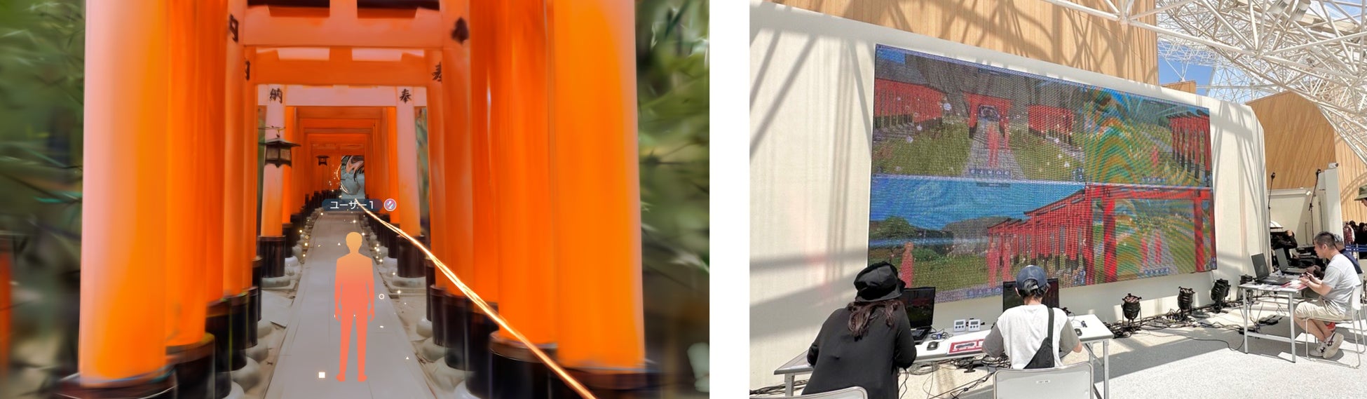3DGS技術を用いて、伏見稲荷大社の境内(楼門、外拝殿、内拝殿、本殿、奥宮、千本鳥居)をデジタル化し、利用者が空間内を自由に周遊できる仮想空間「メタバース」を構築しました。この空間は、まるで現実の空間で参拝しているかのようなイマーシブな(没入感のある)設計で、複数の人が自由に周遊できます。