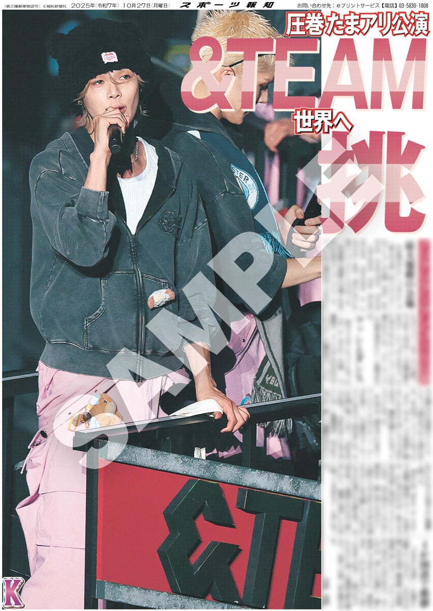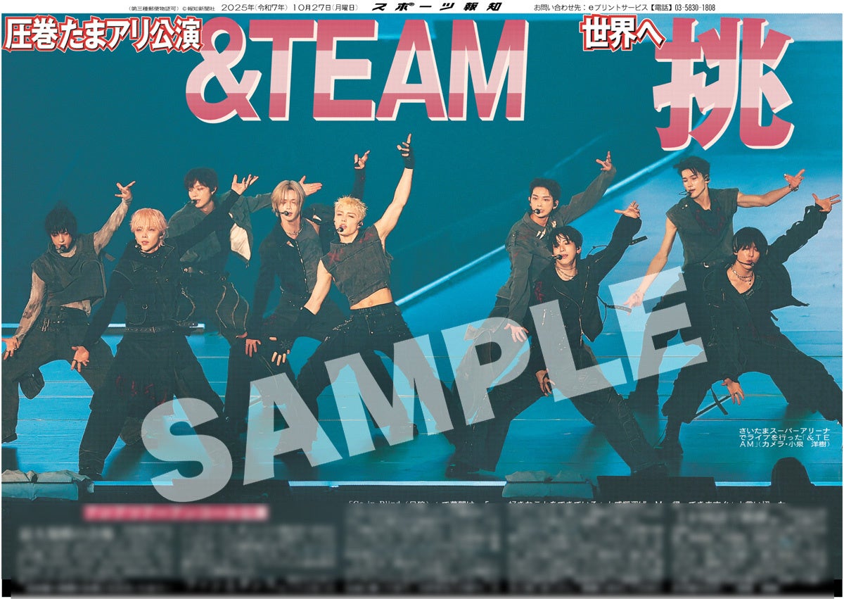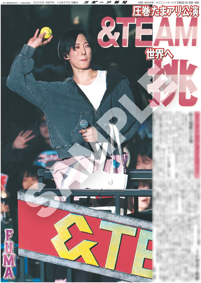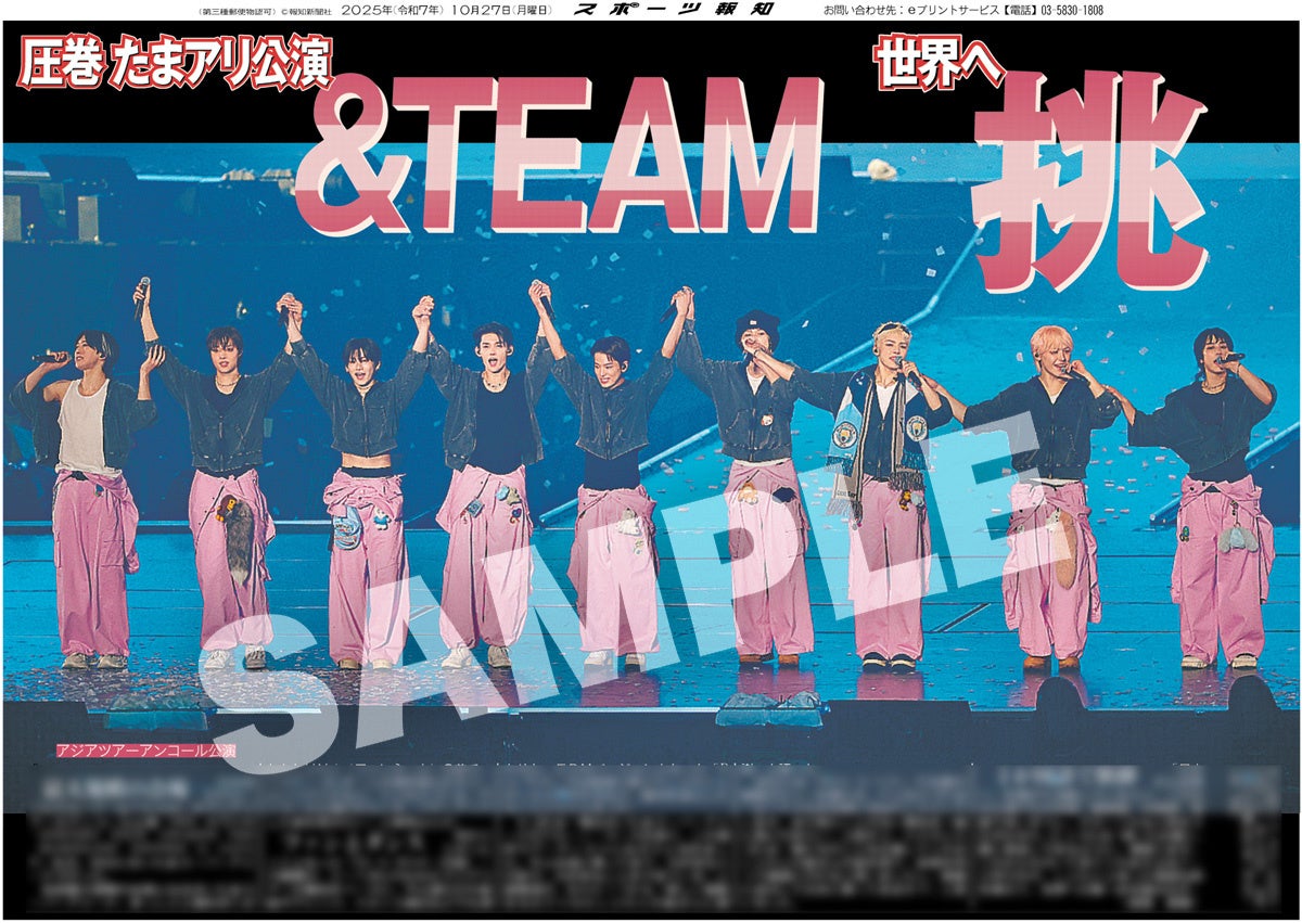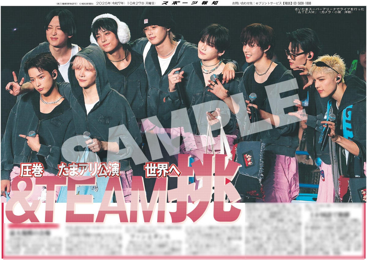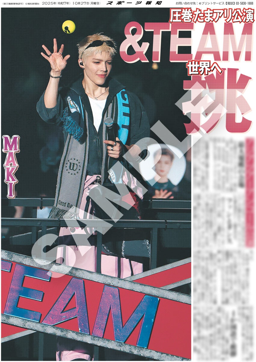 スポーツ報知を発行する報知新聞社(代表取締役社長・長谷川剛)は新聞の一部紙面をコンビニエンスストアのマルチコピー機からプリントできる「スポーツ報知コンビニプリント」サービスを展開中。スポーツ紙ならではの大きな写真を使った紙面をプリント版として販売しています。10月27日付掲載、日本発のグローバルグループ「&TEAM」のアジアツアーのアンコール公演「2025 &TEAM CONCERT TOUR 'AWAKEN THE BLOODLINE' ENCORE in JAPAN」の様子を伝える紙面を発売中。全員パターン4種と個人別9種の合わせて13種類になります。