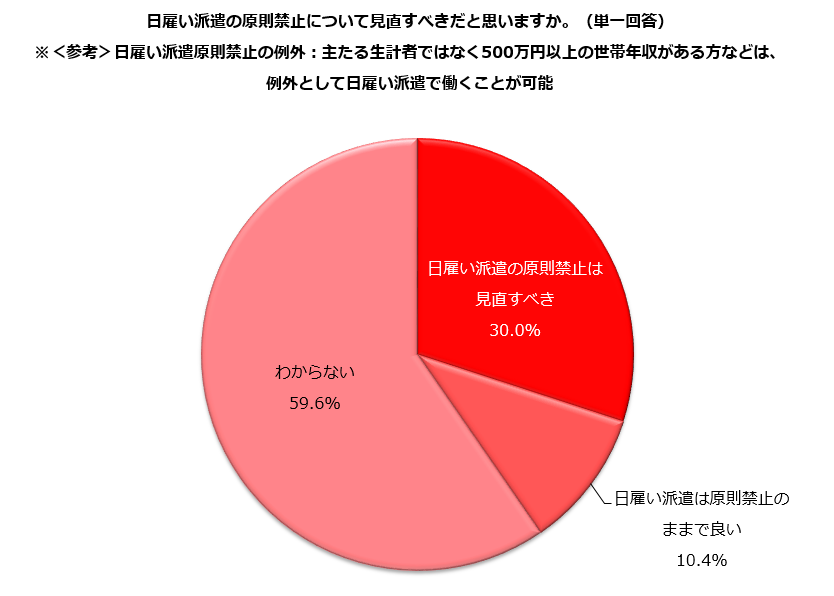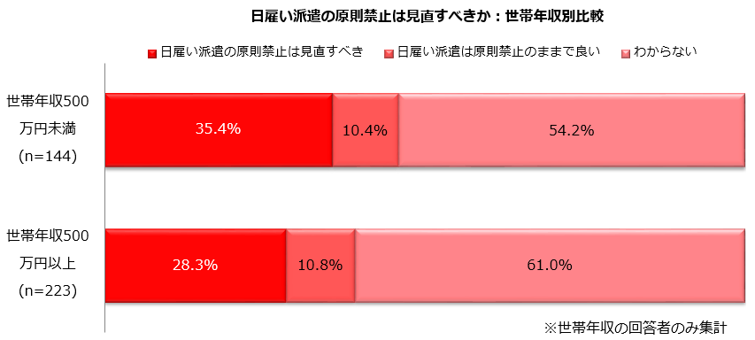 ・そもそも、世帯年収で500万円以上あるなら、日雇い派遣は不要と思うため。世帯年収が低く、短期間しか働けない主婦や健康面に問題を抱えた人にこそ本来は切実に必要と思います(40代:契約社員)