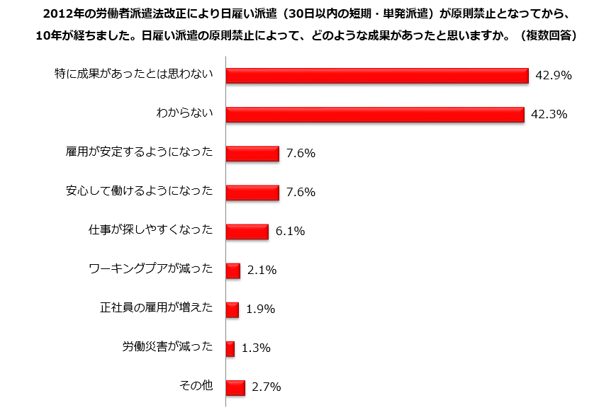 1.日雇い派遣の原則禁止の成果「特に成果があったとは思わない」42.9%