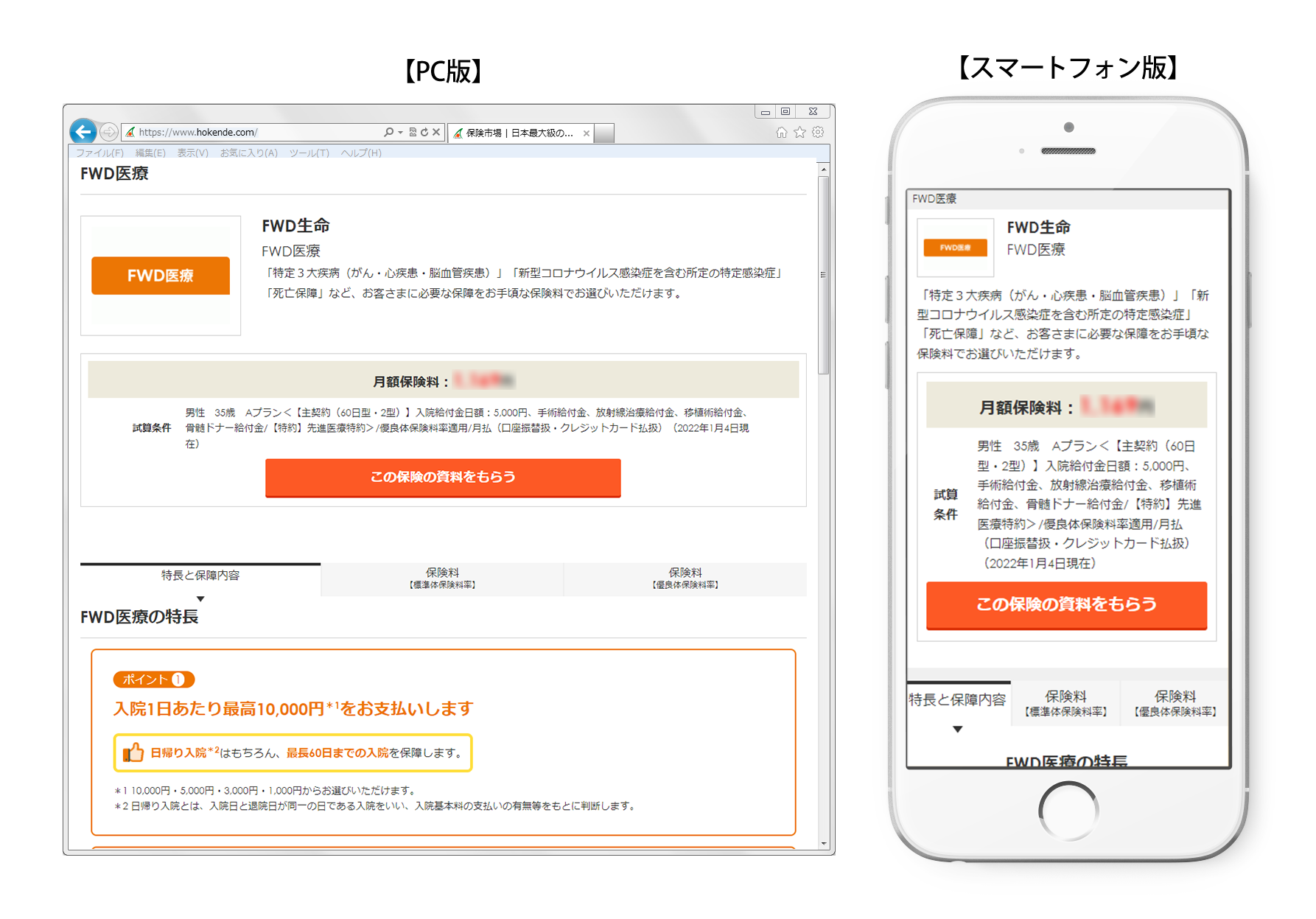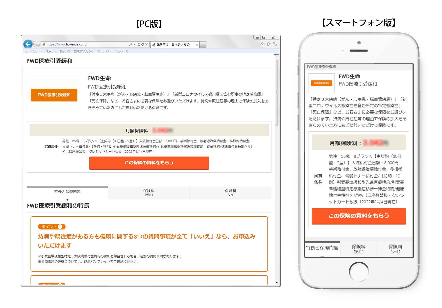 保険選びサイト「保険市場」に掲載を開始したFWD生命の『FWD医療』『FWD医療引受緩和』は、対面販売・通信販売・法人販売・インターネット(現在準備中)でお申し込みいただける保険商品です。「保険市場」PCサイトおよびスマートフォンサイトにて、商品の詳細をご確認いただけます。
