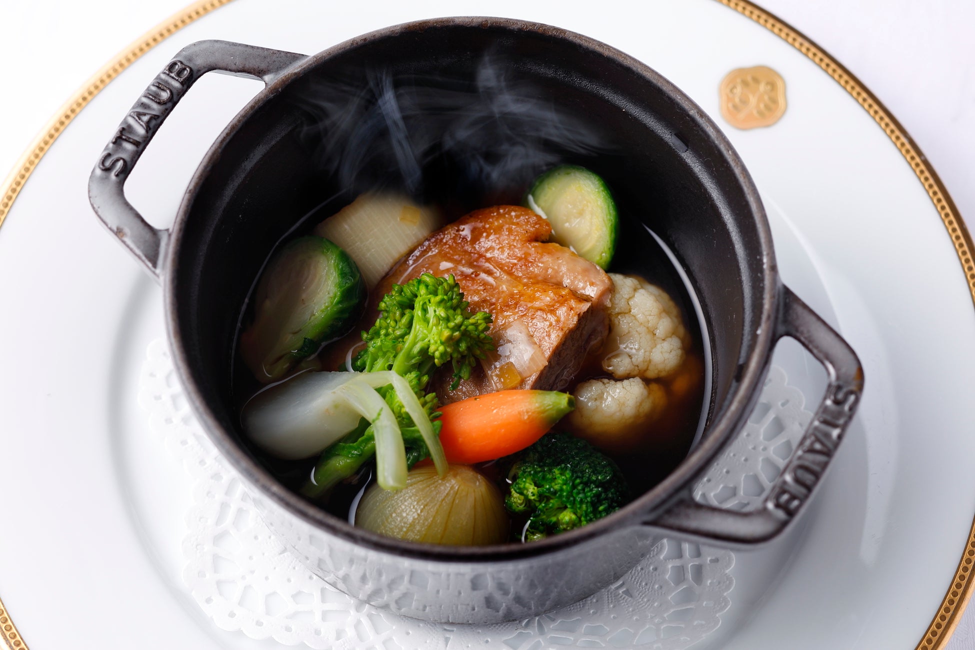 鴨のもも肉をコンフィにし香ばしく焼き上げポトフに仕立てました。スープには資生堂パーラー伝統のコンソメスープに鴨の煮汁やフォアグラのオイルで香りをつけました。