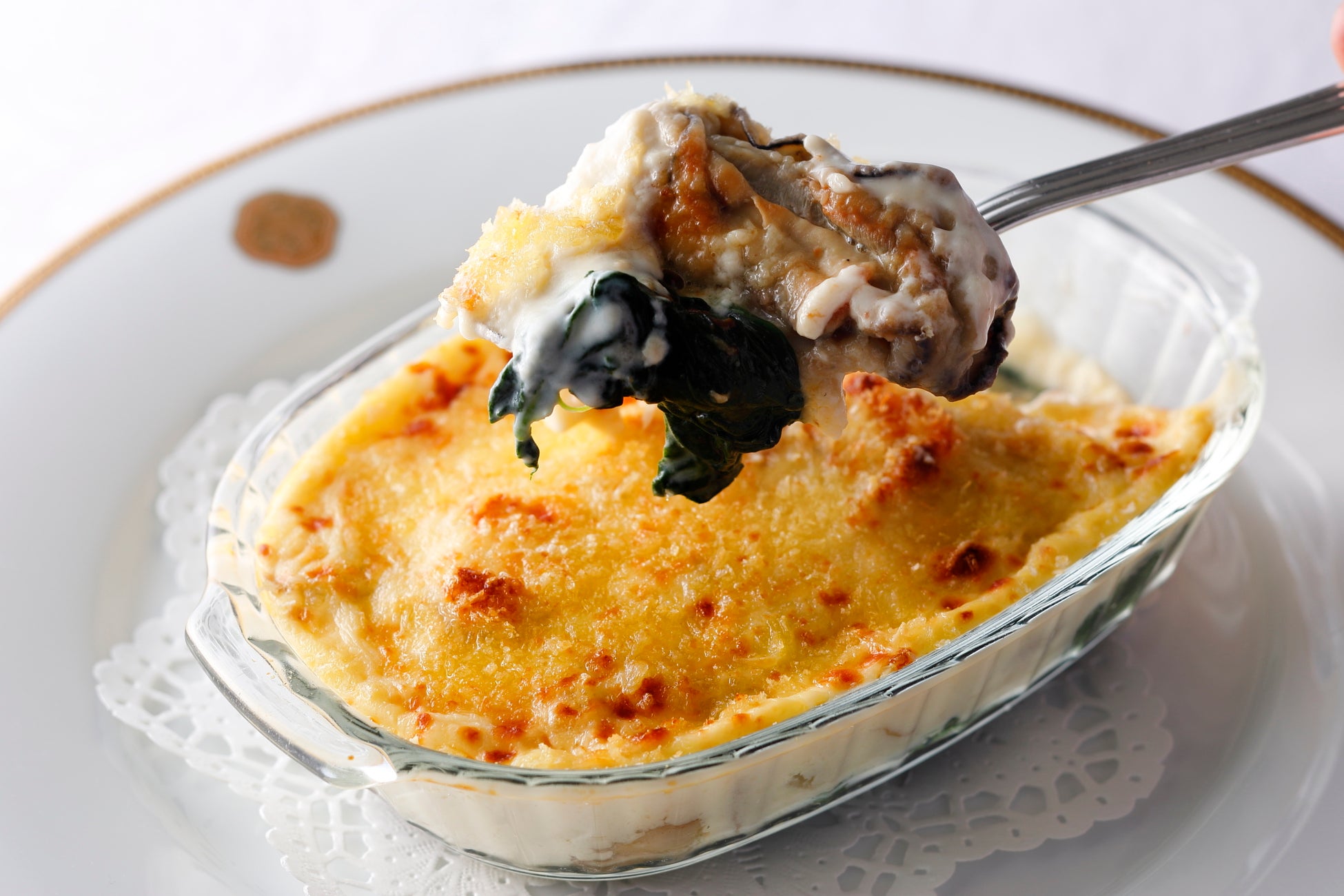 今が旬の牡蠣を楽しむグラタンです。ホウレン草とホワイトソースが牡蠣の美味しさを引き立てます。