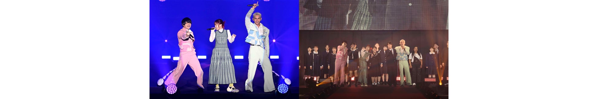 スタートは、おかのやともかとぺルピンズが登場し、オリジナル楽曲『Butterfly』、『runway』を熱唱。会場のボルテージが上がったところで、総勢32名の熊本県の高校生と麻生専門学校グループの在校生が登場し、日本が世界に誇る漫画家・尾田栄一郎氏原作のTVアニメ『ONE PIECE』の初代OPテーマ『ウィーアー!』に続き、『怪獣の花唄 / Vaundy』で爽やかに駆け抜け、そして歌詞とリンクする学生たちのリアルな歌声が感動を呼んだ『僕のこと / Mrs. GREEN APPLE』の、一日限りのスペシャルメドレーを披露!