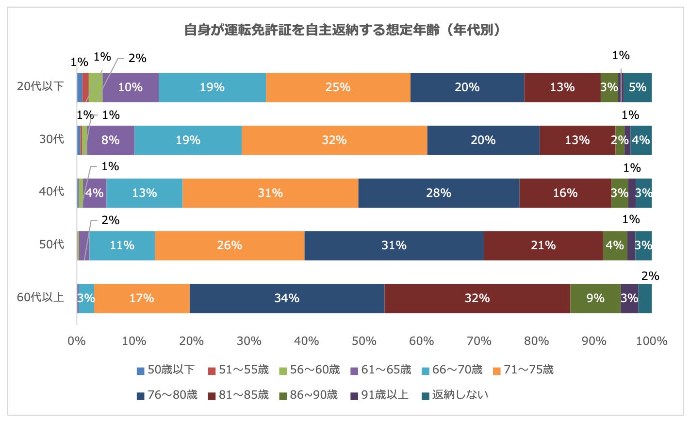 年代別に見ると、60代以上は他の年代と比較して「81〜85歳」が32%と10ポイント以上高く、「86〜90歳」も9%と5ポイント以上高い結果となりました。60代以上は返納時期をより高齢で考えている人が多いことが明らかになりました。