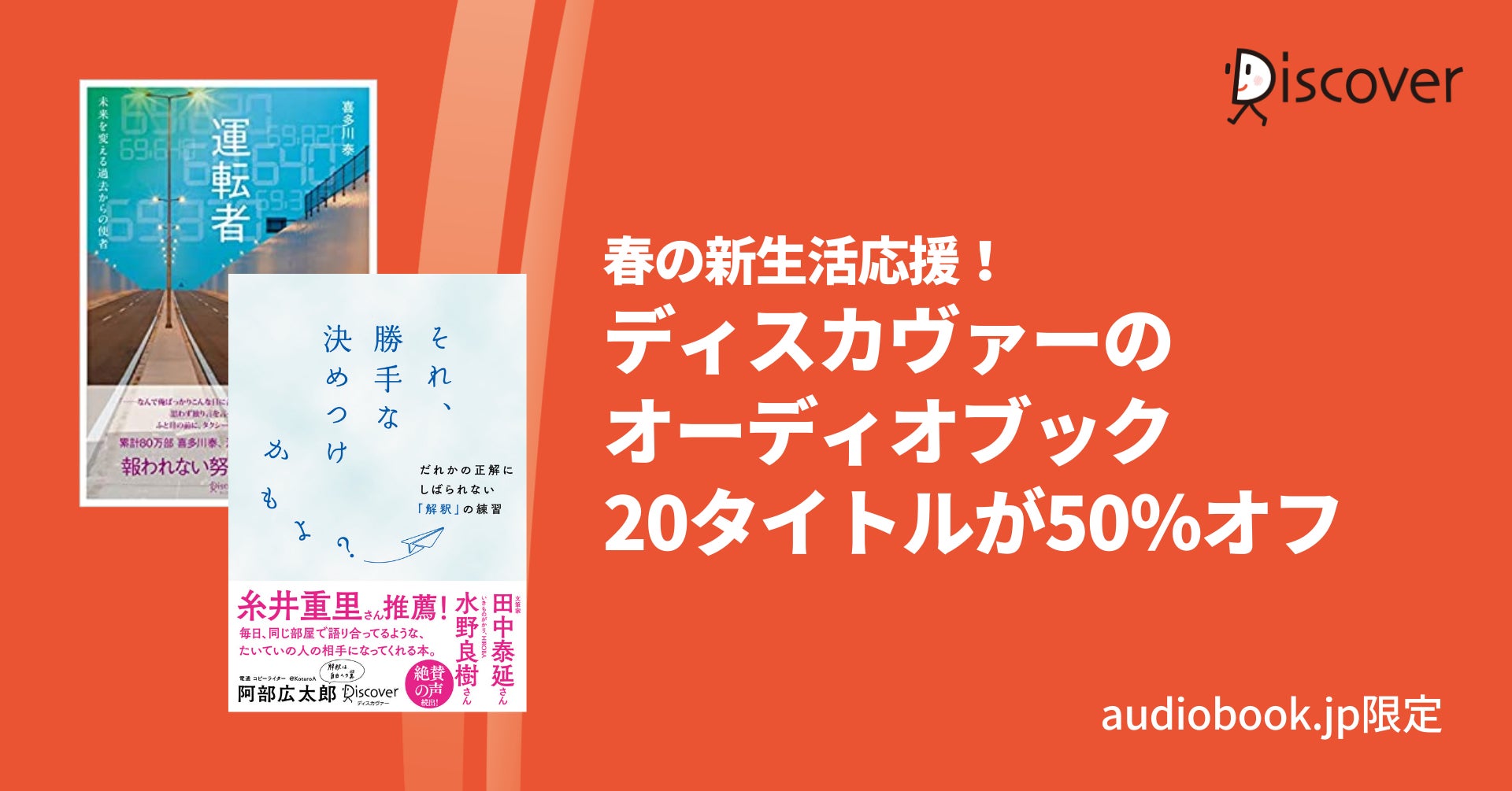 株式会社ディスカヴァー・トゥエンティワン(本社:東京都千代田区、取締役社長:谷口奈緒美)は、2022年4月4日から4月17日の14日間、audiobook.jpにてディスカヴァーのオーディオブック20タイトルが50%オフになる割引キャンペーンを開催しています。