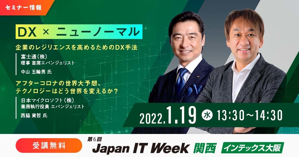 RX Japan株式会社は2022年1月19日(水)~21日(金)の3日間、インテックス大阪で「第6回 Japan IT Week 関西」を開催します。9つの展示会で構成される本展は、ITの各分野を幅広く網羅した関西最大*のIT展示会です。