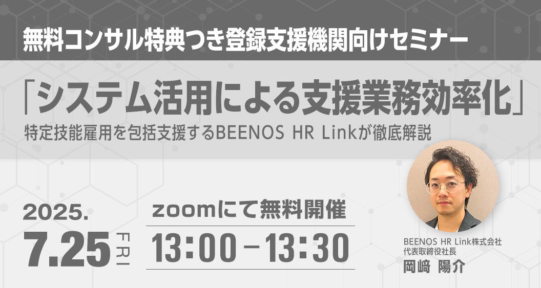 BEENOS株式会社(東証プライム:3328)の連結子会社で、特定技能雇用を包括支援するBEENOS HR Link株式会社(以下「BEENOS HR Link」)は特定技能の登録支援機関に向けてシステム活用による支援業務効率化について解説する定期セミナーを7月25日(金)に開催いたします。