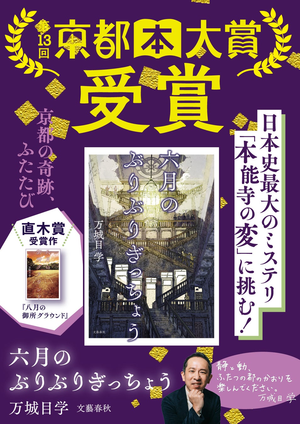 京都を舞台に、青春の愛しく、ほろ苦い味わいを綴った万城目学さんの第170回直木賞受賞作『八月の御所グラウンド』に連なるシリーズ第2弾、『六月のぶりぶりぎっちょう』が、第13回京都本大賞に輝きました。